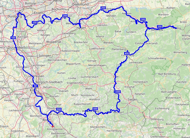 Miniprotokoll: Mo 21.08.21: Rhein, von Bonn nach Duisburg (114 km) Di 22.08.21: Ruhr, von Duisburg nach Hagen (106 km) Mi 23.08.21: Ruhr, von Hagen nach Olsberg (116 km) Do 24.08.21: Ruhetag, Besuch in Bestwig FR 25.08.21: Ruhr-Sieg-Radweg, von Olsberg nach Kirchen (127 km) Sa 26.08.21: Sieg, von Kirchen zurück nach Bonn (111 km) |