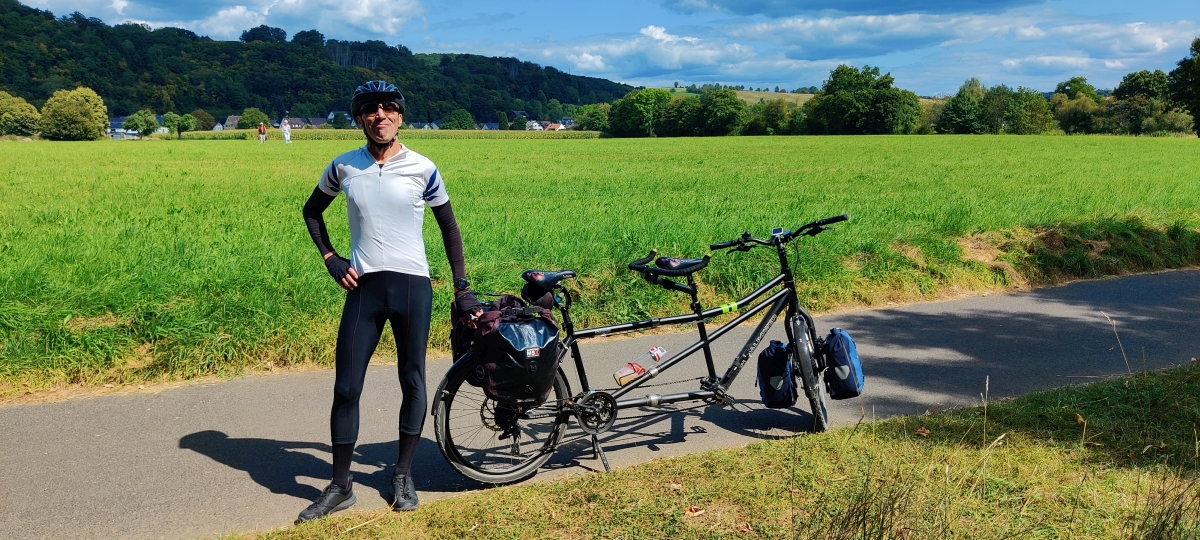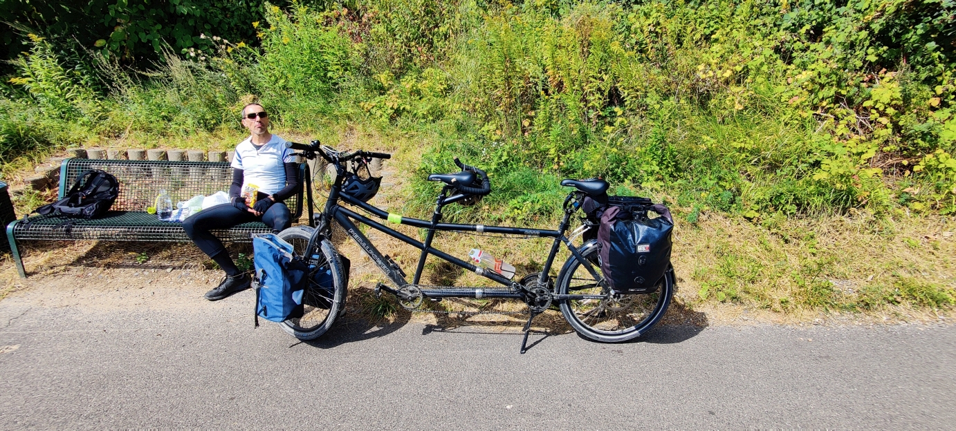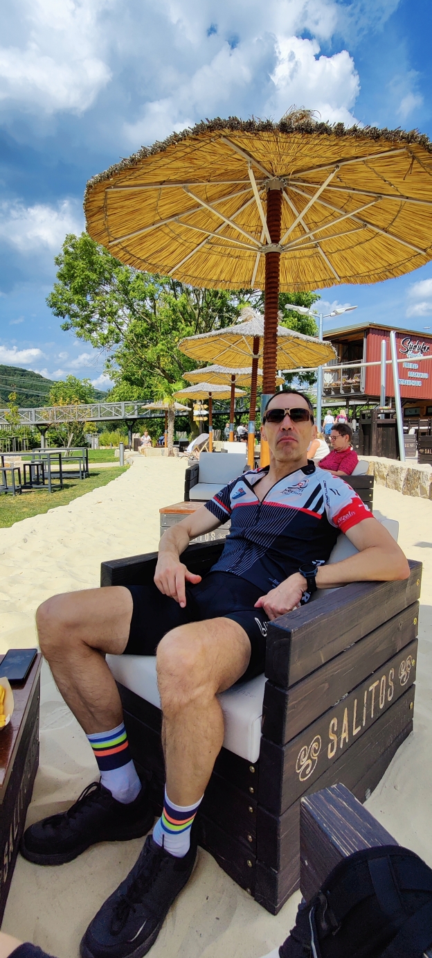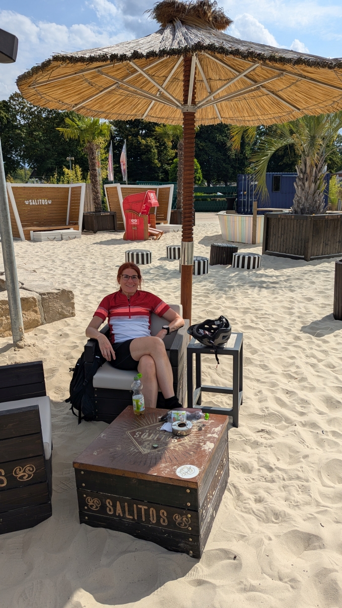Naechster Radeltag die Ruhr flussabwaerts, kurze Pause in der Strandbar