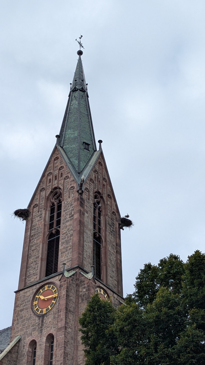 Erster Wandertag: Storchennester im Kirchturm von Hausach